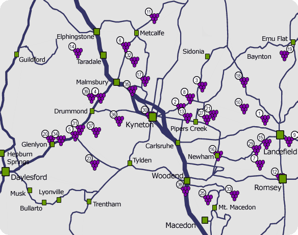 1. Ashworths Hill 2. Bald Hill 3. Ballandry Estate 4. Basalt Ridge 5. Big Shed Wines 6. Blackgum Estate 7. Braewattie 8. Candlebark Hill 9. Cleveland 10. Cobaw Ridge 11. Coliban Valley 12. Cope-Williams 13. Flynn & Williams 14. Fryerstown Road 15. Glen Erin 16. Hanging Rock 17. Hawksmoor 18. Knight Granite Hills 19. wili-wilia winery 20. Ellender Estate 21. Loxley 22. Macedon Ridge 23. Moonstruck 24. Mount Charlie 25. Mount Macedon 26. Mount William 27. O'Shea & Murphy 28. Portree 29. Rochford 30. Rock House 31. Sandy Farm 32. Snodgrass Creek 33. Straws Lane 34. Teneal Creek 35. Tarrangower Estate 36. Virgin Hills 37. Wombat Forest 38. Woodend Winery 39. Zig Zag Road